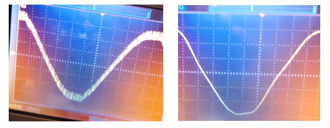下圖中左邊是疊加不同頻率的高頻波形后的合成波形;右邊波形分別是通過本諧波保護器后的波形,即并入本諧波保護器后的波形。